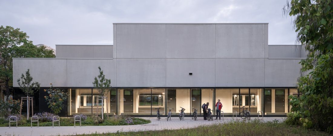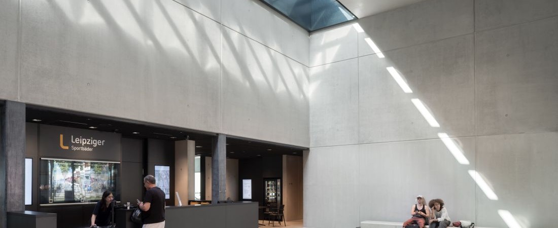 In Leipzig Neuschönefeld entstand auf dem Otto-Runki-Platz eine neue Sportschwimmhalle. Auf dem zuvor unbebautem und als Grünfläche genutztem Grundstück ist das Gebäude freistehend errichtet. Es beherbergt ein 25 Meter Sportschwimmbecken, ein Nichtschwimmerbecken sowie ein Kleinkinderbecken. Das Gebäude besteht aus Untergeschoss, Erdgeschoss und einem Obergeschoss. Im Untergeschoss werden die haustechnischen Anlagen für die Schwimmbecken angeordnet. Im Erdgeschoss befinden sich die Schwimmbecken, Umkleideräume und sonstigen Aufenthaltsräume. Im Obergeschoss werden weitere haustechnischen Anlagen untergebracht. Das Gebäude ist teilweise im Bereich der Schwimmbecken unterkellert flach auf einer durchgehenden Bodenplatte gegründet werden. Der nicht unterkellerte Bereich wird mit Einzel- und Streifenfundamenten gegründet. In diesem Bereich wird eine nichttragende Bodenplatte angeordnet. Bei der Zusammensetzung des Betons für WU-Bauteile müssen langsam abbindende Zemente verwendet werden, um eine geringe Hydratationswärme zu entwickeln und somit die Schwindrisse auf ein geeignetes Maß zu begrenzen. Bei der Herstellung der Außenwände wurden Arbeitsfugen und Schwindfugen geplant und in einem sinnvollen Maß eingesetzt.